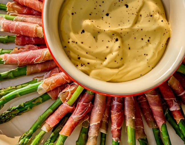 Envolva cada aspargo com presunto de Parma e reserve para servir com o molho béarnaise.