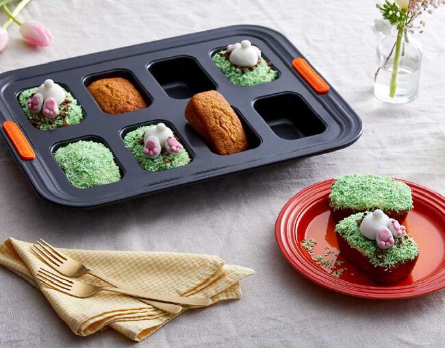 - Quando estiver pronto para montar, espalhe um pouco de cobertura de baunilha por cima de cada bolo. Polvilhe com o coco colorido para representar a grama (pressione levemente para garantir que esteja suficientemente grudado). Onde você quiser que o coelho se enterre, polvilhe com uma pitada de migalha do biscoito de chocolate.