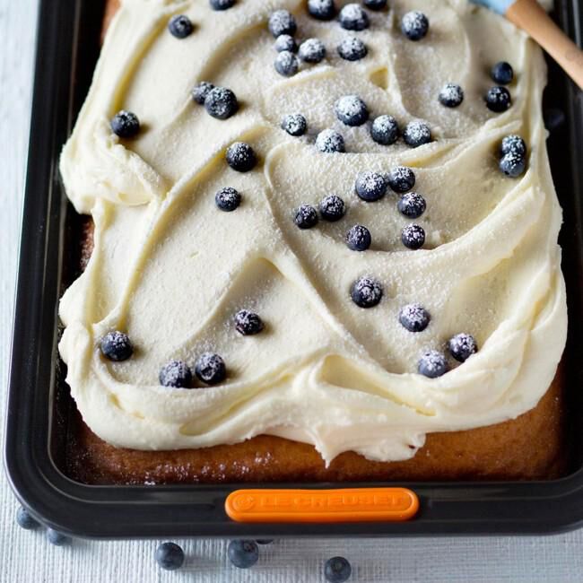 Preaqueça o forno a 180°C/160°C; Em uma panela molheira, aqueça o leite e a manteiga até que ela derreta, permita que a mistura esfrie um pouco; Em um bowl redonda, bata os ovos, o açúcar e a essência de baunilha; Peneire a farinha e o fermento e, suavemente, misture a mistura dos ovos junto com a mistura do leite e manteiga; Despeje a mistura sobre a forma retangular, e asse por 30 a 35 minutos ou até que um palito inserido no meio do bolo saia limpo e seco; Para fazer a cobertura glaceada, bata a manteiga em um bowl grande; Adicione o açúcar gradualmente, alternando o leite quente quando a mistura engrossar; Bata com um batedor elétrico até que a mistura fique suave e clara; Espalhe a cobertura uniformemente sobre o bolo já fresco e cubra com os mirtilos; Corte o bolo em quadrados e sirva.