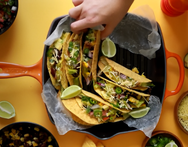 - Aqueça suas conchas de taco de acordo com as instruções da embalagem. Para montar seus tacos, encha a concha com alface, cubra com a mistura de milho e feijão preto, depois a salsa e finalize com guacamole e queijo.