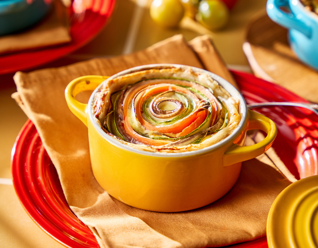 Organize as lâminas de legumes de forma espiralada, intercalando as cores até preencher todo o refratário.